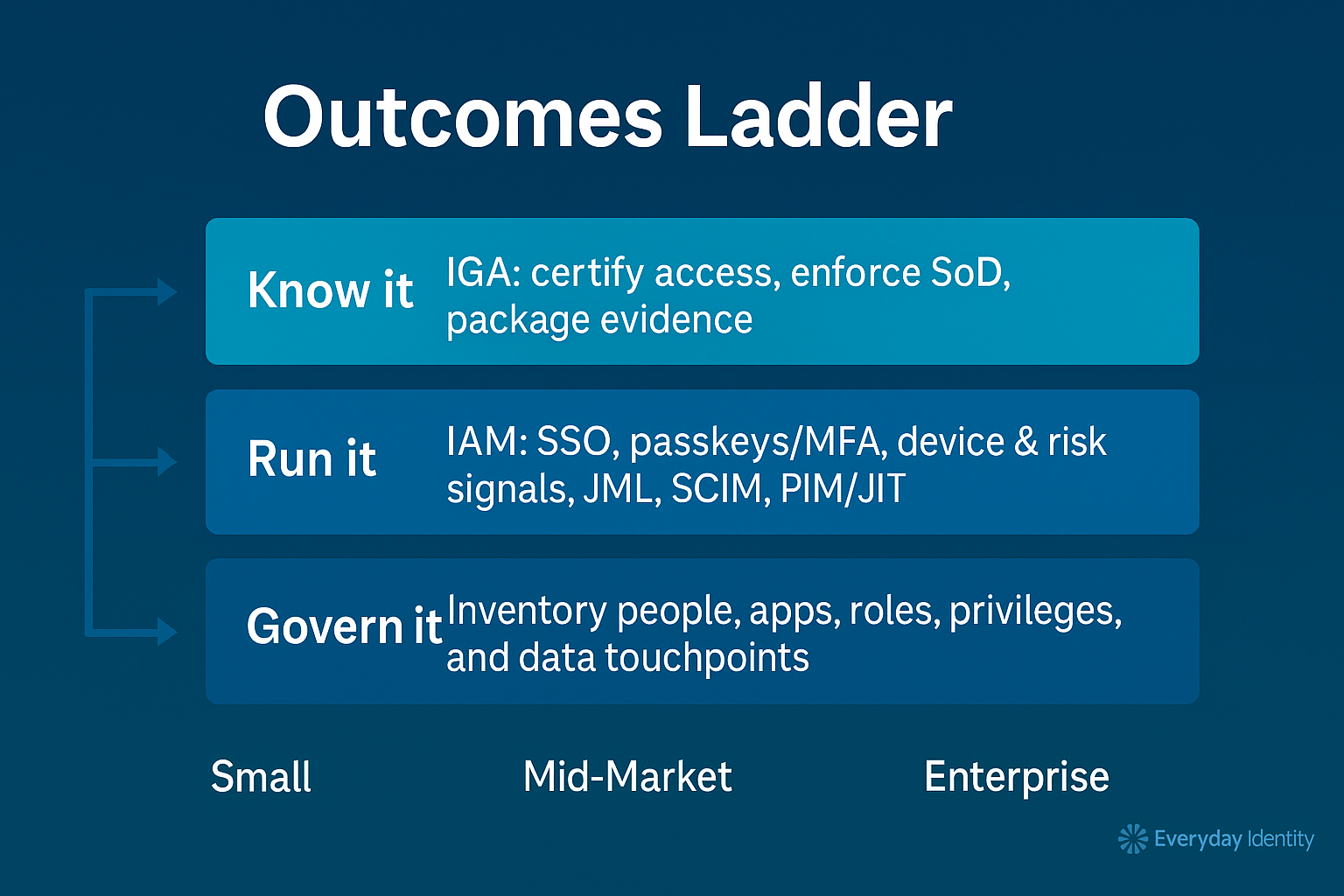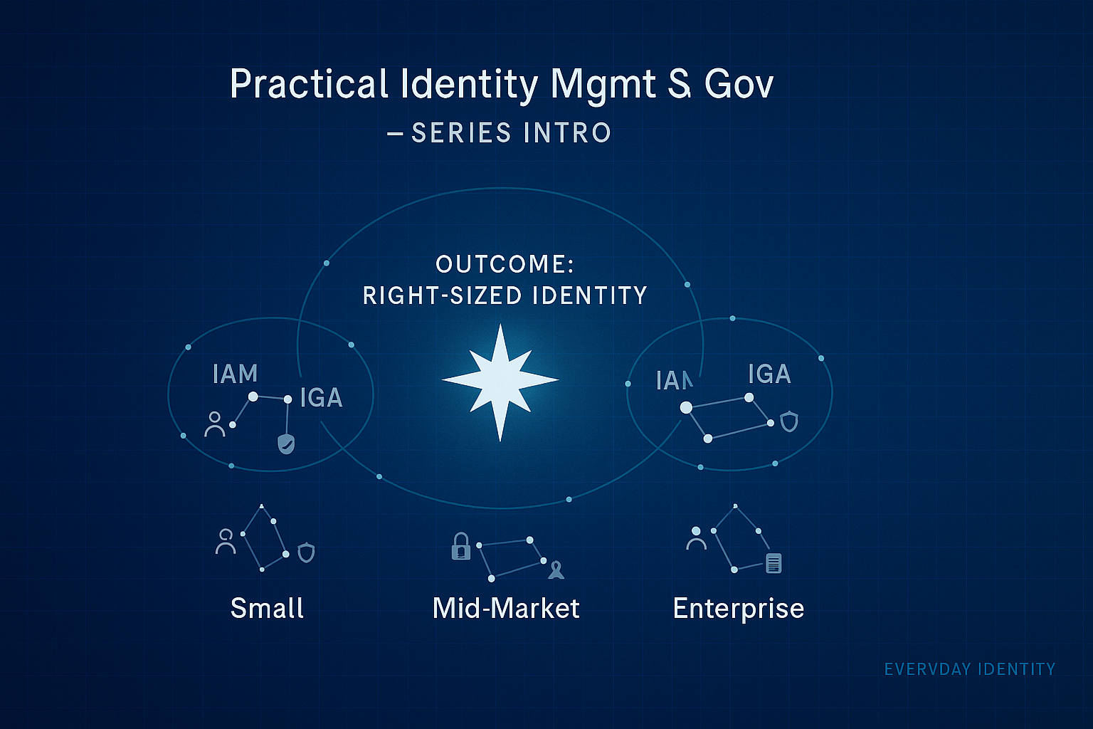 Identity work breaks when teams buy governance before they stabilize access, or when they over-index on a single vendor instead of designing for outcomes and clean handoffs. This series gives you a right-sized path for Startups/Small, Mid-Market, and Enterprise/Large organizations—so you can move fast without painting yourself into a corner.